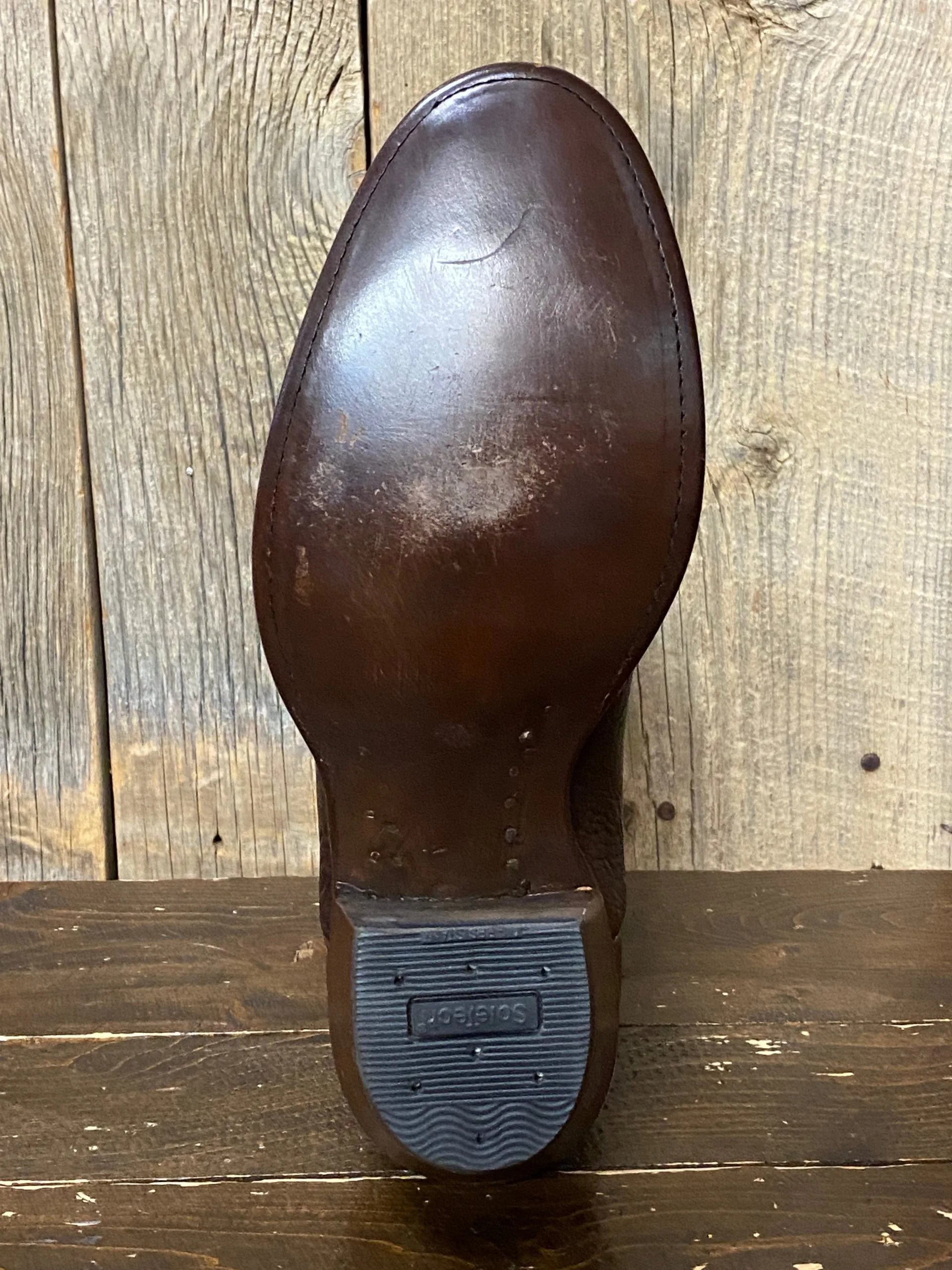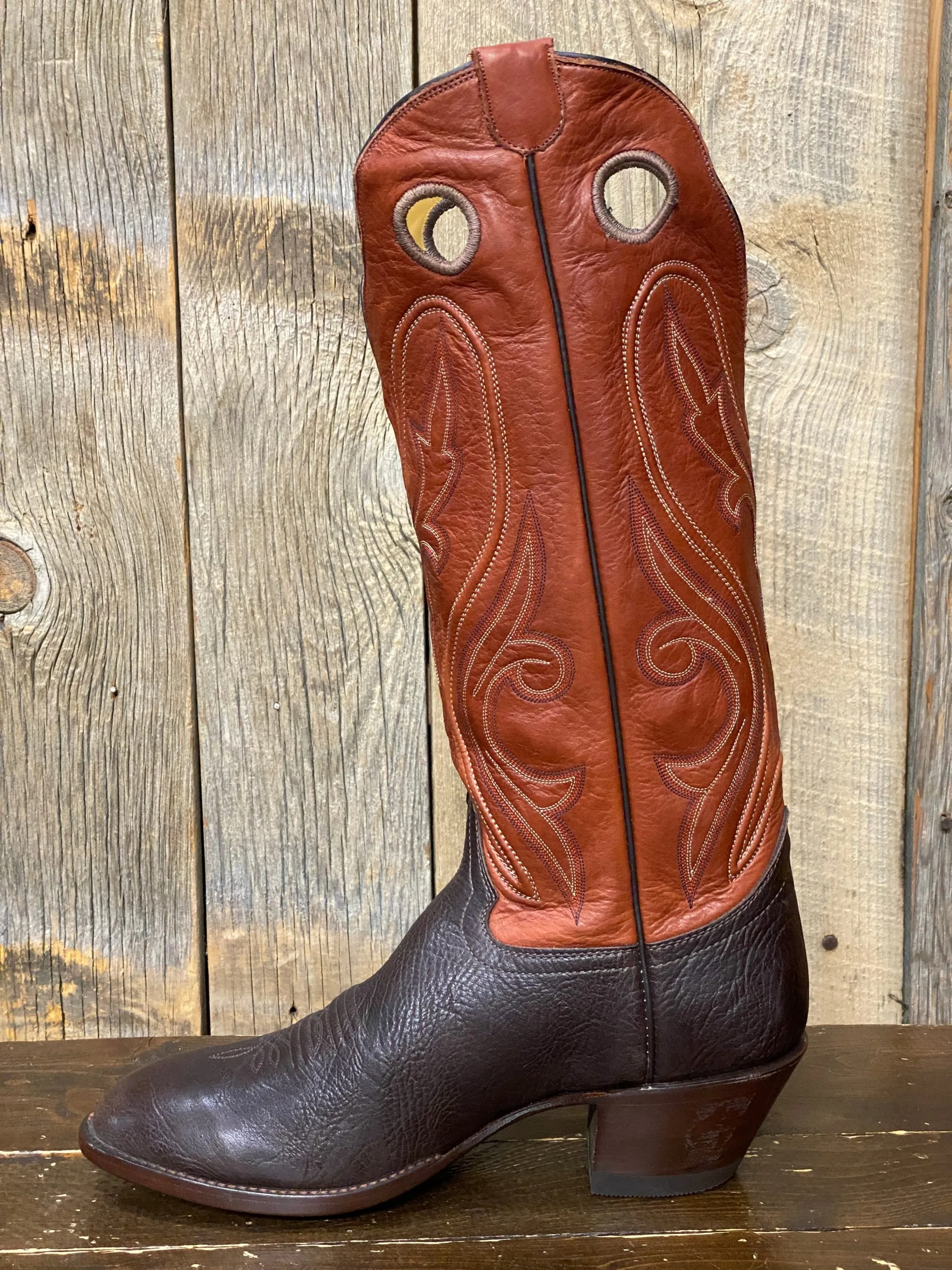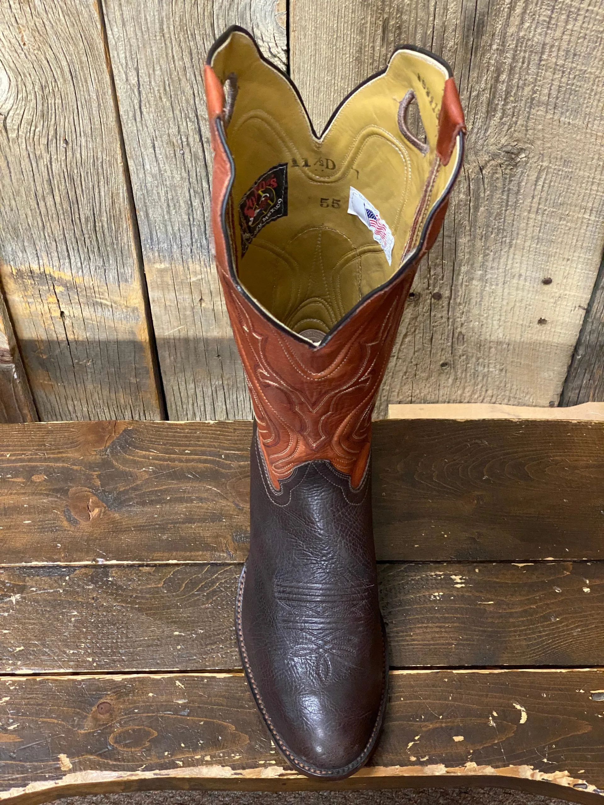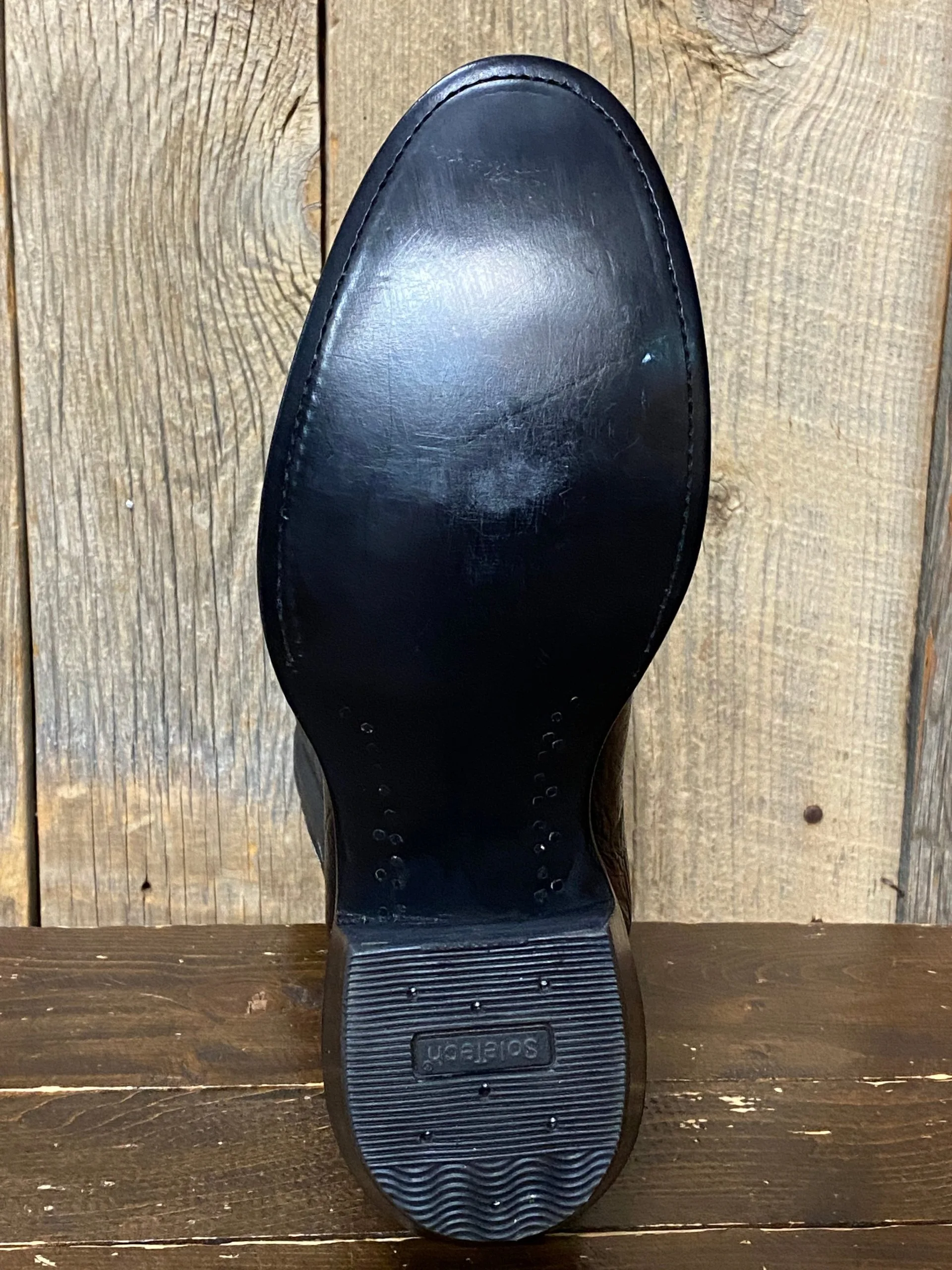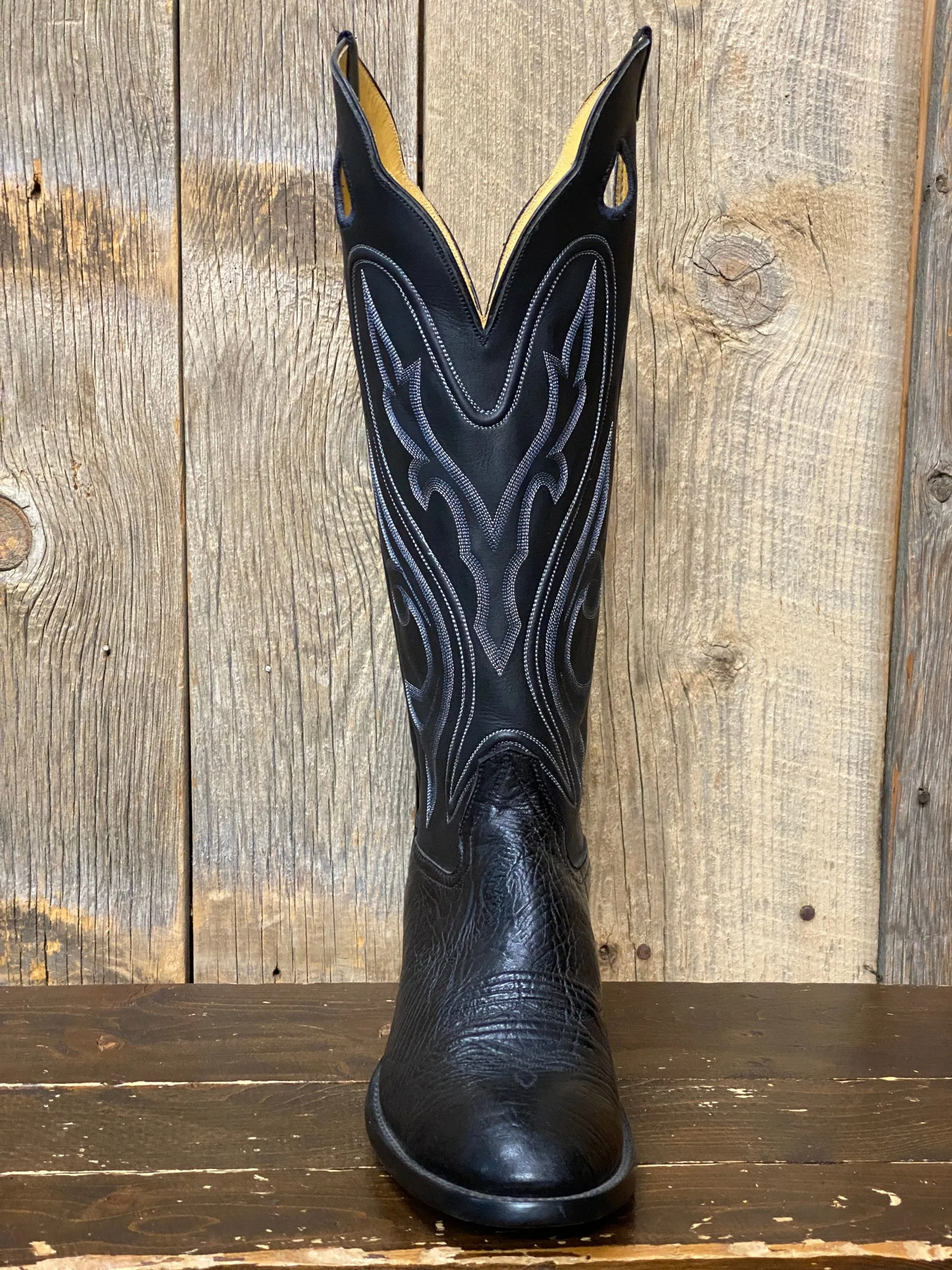 These tough, classic Honcho Solano® Bailando Cowboy Boots are handmade in the USA using full grain leather foot and shaft and black cowhide shoulder vamp. The boots feature extra deep scallops, pull-holes, 6-row stitch shaft, leather lining, and insole and a single row stitch outsole, giving you a reliable and comfortable fit. With a round toe profile and a 2 1/4″ underslung riding heel, these boots are perfect for long-lasting wear.