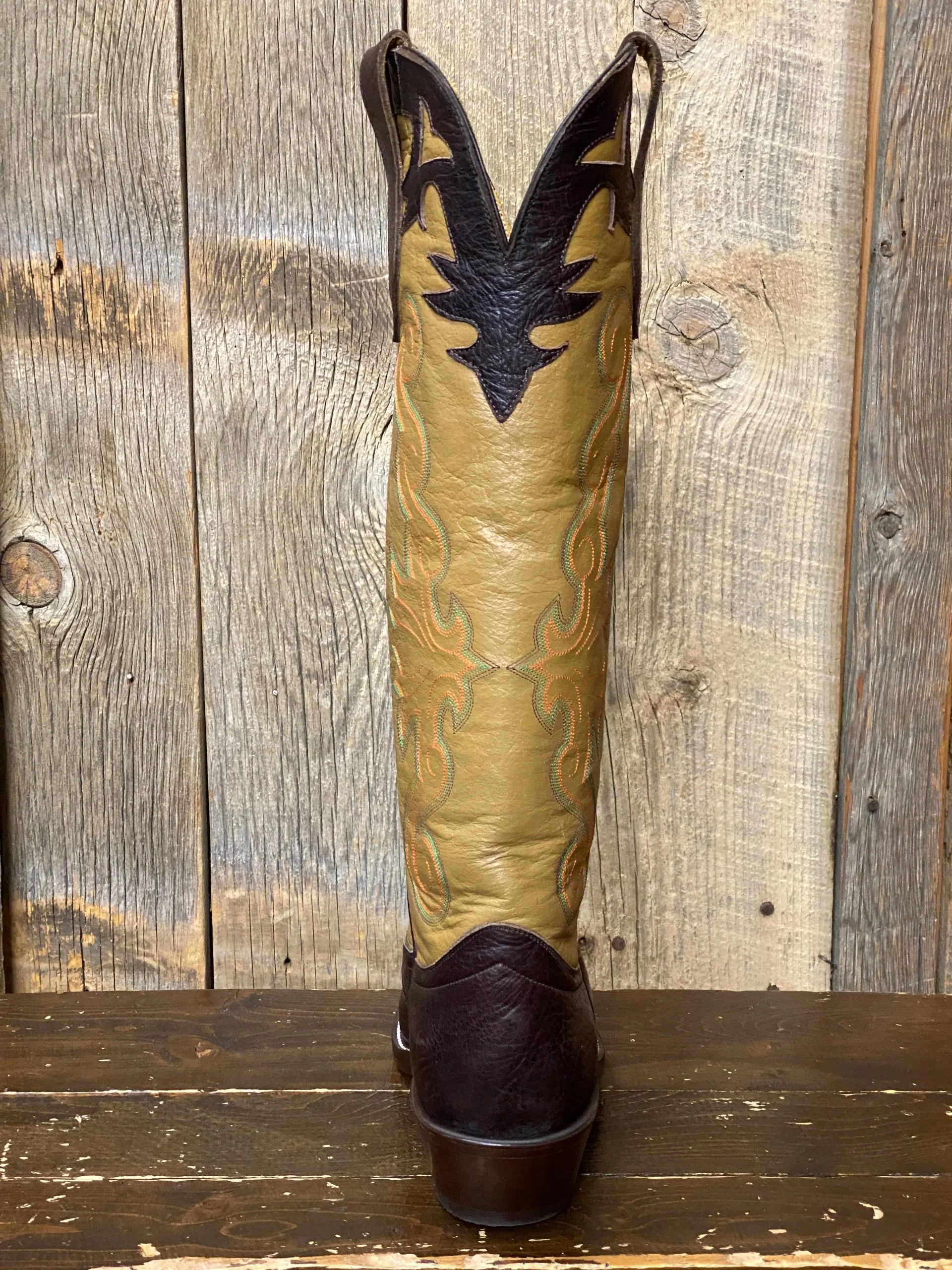 These Honcho Solano® Buckaroo Tall Top Cowboy Boots are handmade in the USA with full grain leather for a durable, sophisticated look and luxurious feel. The boots feature a deep 16″ or 18″ top and 6-row stitching on the shaft, as well as a double leather outsole with single row stitching. They also have a round toe profile and a 2 1/4″ underslung riding heel with a spur ledge.