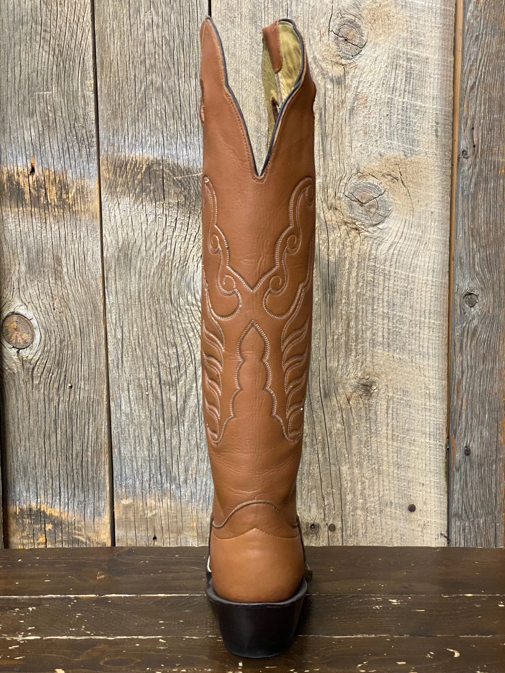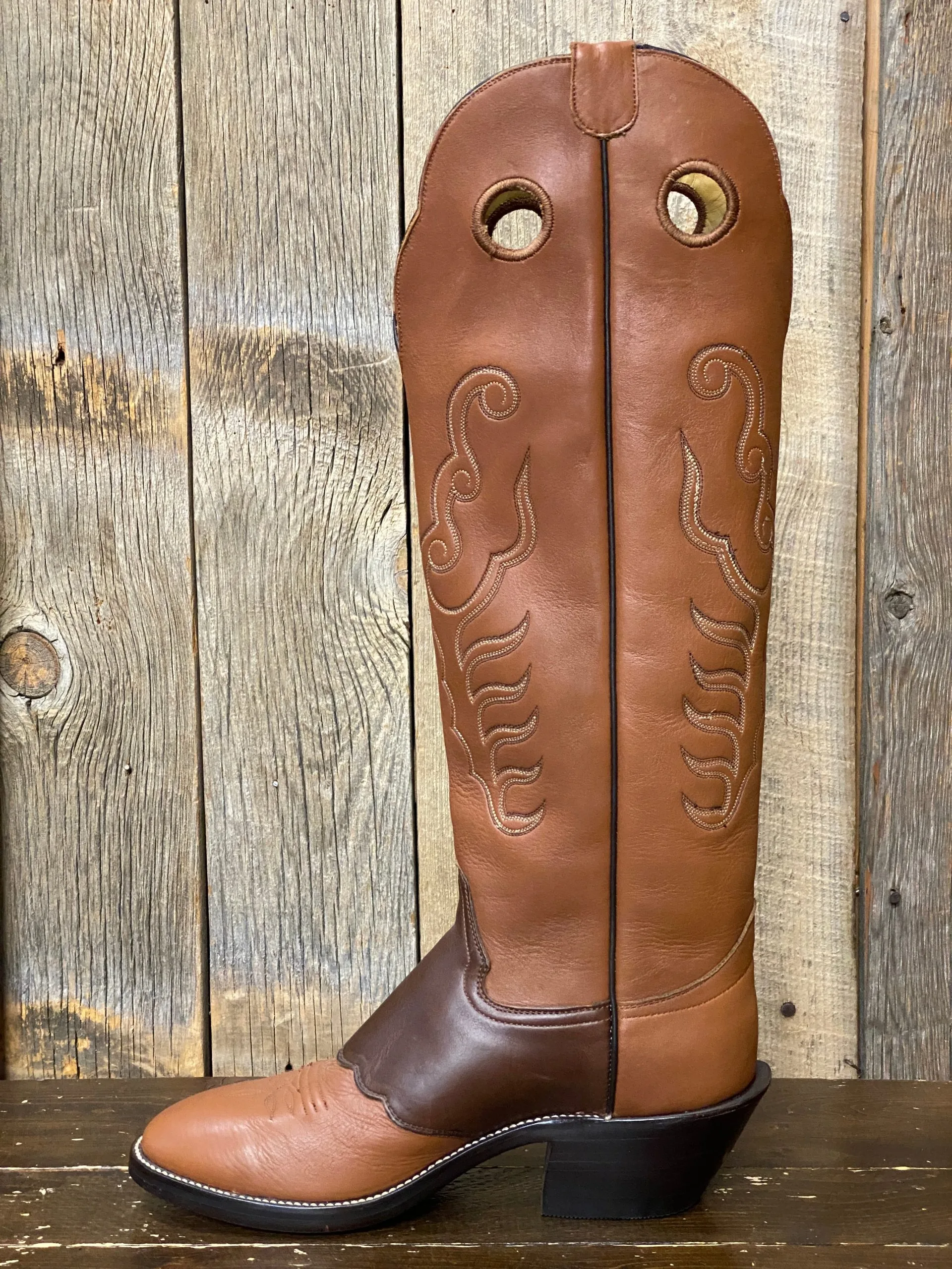 Honcho Solano® Cattleman Tall Top Cowboy Boots are crafted by hand in El Paso, TX. They feature full grain leather on the foot and shaft, with a 16″ brown mule top and chocolate mule saddle. The deep scallop, 4-row stitching, and pull holes give it a traditional, authentic look. Comfort is guaranteed with the leather insole and double leather outsole. Finished with a round toe profile and 2 1/4″ underslung heel with spur ledge.