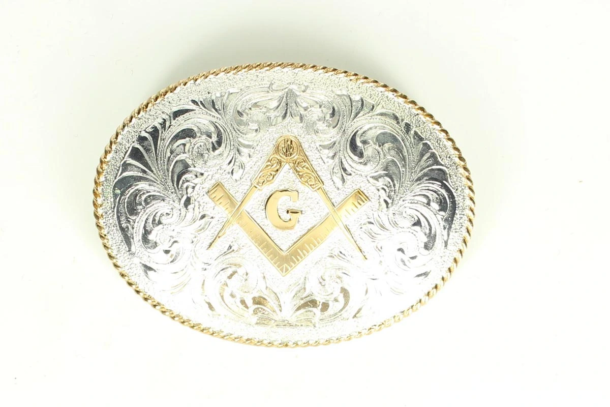 - Buckle features a gold plated Mason motif on a silver plated filigree background