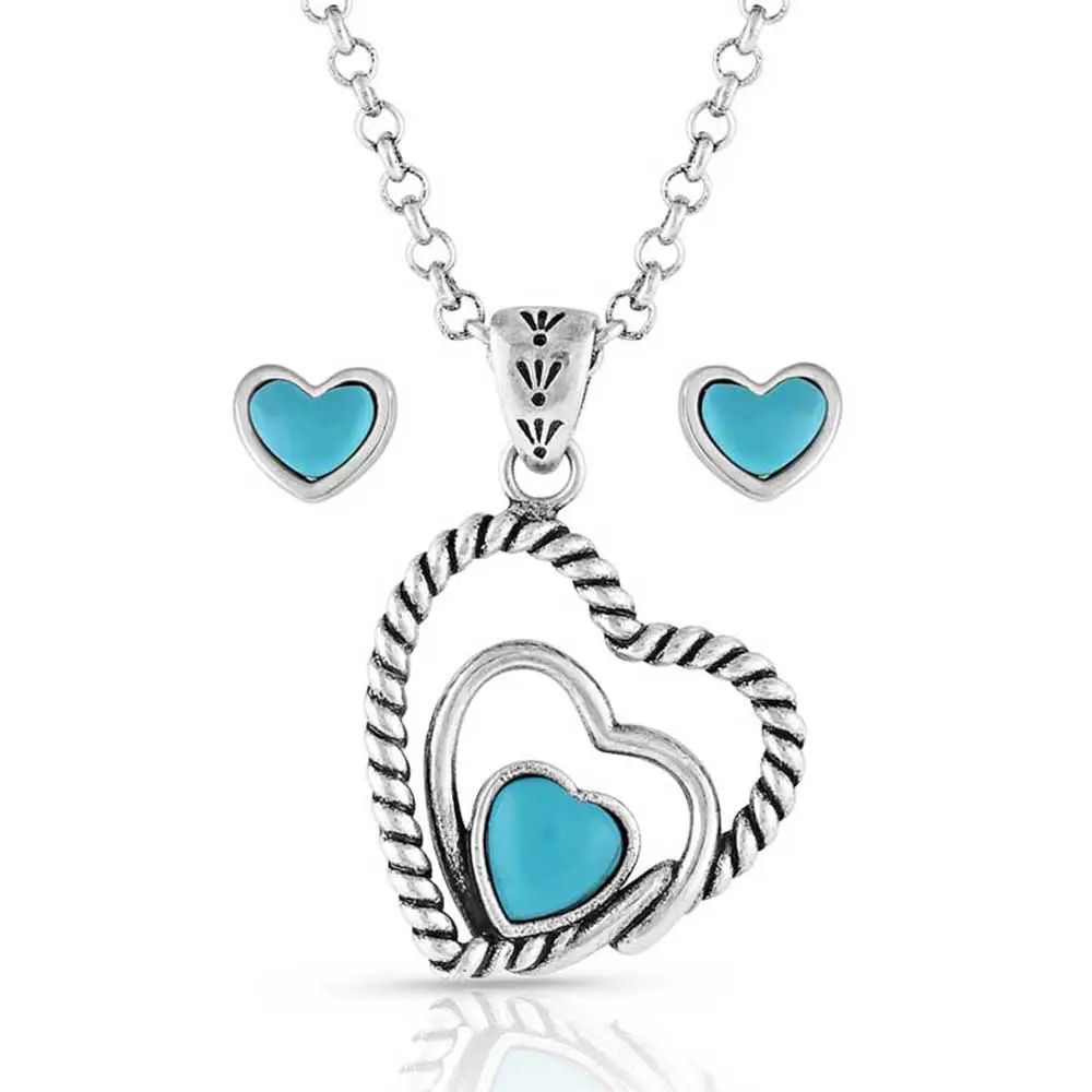 Like ripples in a crystal-clear blue pond after you throw a rock in the water the heart on this pendant just keeps radiating outward. The Clearer Ponds Turquoise Heart Jewelry Set includes a pair of earrings and a necklace. The pendant is a lovely turquoise stone in a silver setting, slightly larger is a smooth silver heart, and larger than the previous heart a silver twisted rope in a shape of a heart. The necklace hangs from a 19 inch silver chain. The matching stud earrings are a singular heart shaped turquoise stone framed by a smooth silver and a hypoallergenic post back.