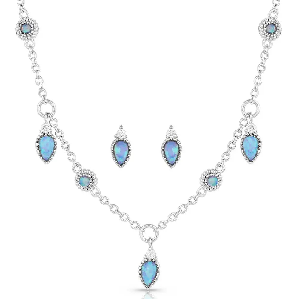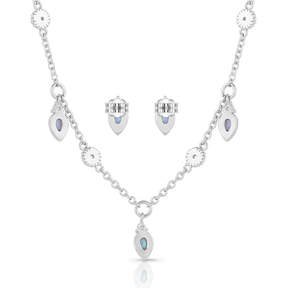 The Charmers Opal Jewelry Set is the new must-have Montana Silversmiths jewelry. The necklace details a silver-toned chain with small round opals surrounded by a rope edge. Teardrop opal with a sparkling clear cubic zirconia stone sitting above opal creates the swinging charms. The charms hang from the 21 inch chain and create the necklace featuring movement in the design. The matching earrings are the small opal charms secured by a hypoallergenic post-back wire to complete the jewelry set.