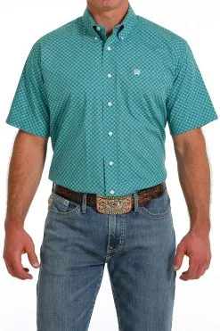 Cinch® Men’s Turquoise Geo Print Short Sleeve Button Front Western Shirt